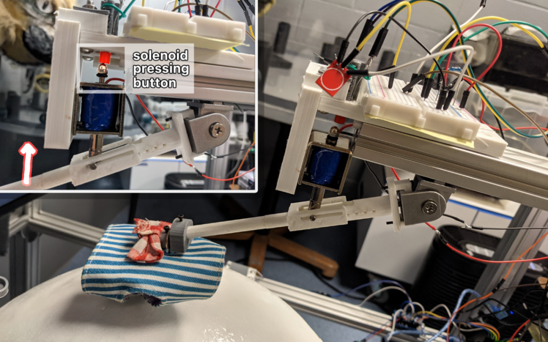 老鼠前进到一个恶魔时,软件就会检测到恶魔在其附近。最初老鼠不知道在这种情况下该做什么,所以训练软件控制的推拉螺线管将小鼠稍微抬高,让它的头部接触到一个按钮。