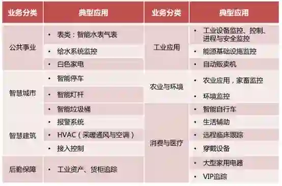 此前,GSMA就针对NB-IoT技术定义了7大类21个典型应用场景,这些场景如下表所示: