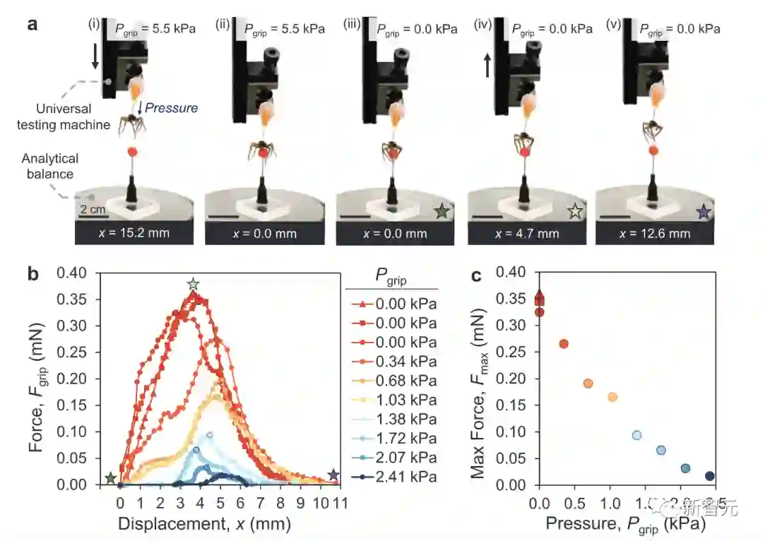 上图则是研究人员测试出的「僵尸蜘蛛」的抓力。通过对比八个不同的抓取压力结果发现,抓取压力的增加会导致抓取力的下降。