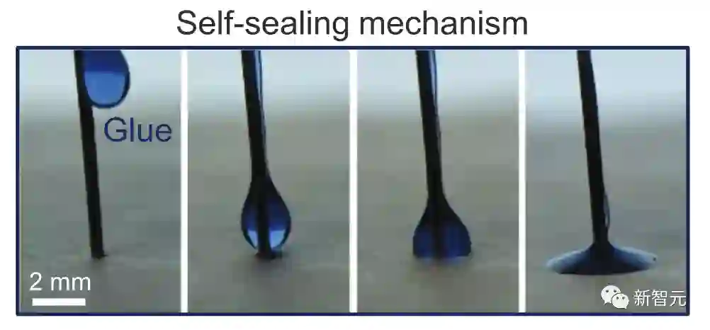 首先,胶水液滴被注射到针头的一侧,附着在上面,使针头表面的能量最小化。