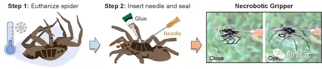 最后,在胶水凝固后(该研究使用的是氰基丙烯酸酯胶水,约10分钟凝固),将注射器连接到皮下注射针头的鲁尔锁端(Luer lock)。这样就完成了蜘蛛死体抓取器的制作。