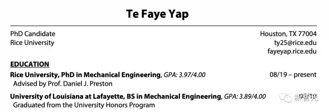 论文一作Te Faye Yap目前莱斯大学机械工程的博士研究生,导师便是这次论文通讯作者Daniel Preston教授。