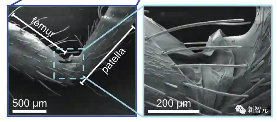 同时用电子显微镜扫描了狼蛛髌骨股关节的图像,具体地展现了关节膜的样子。