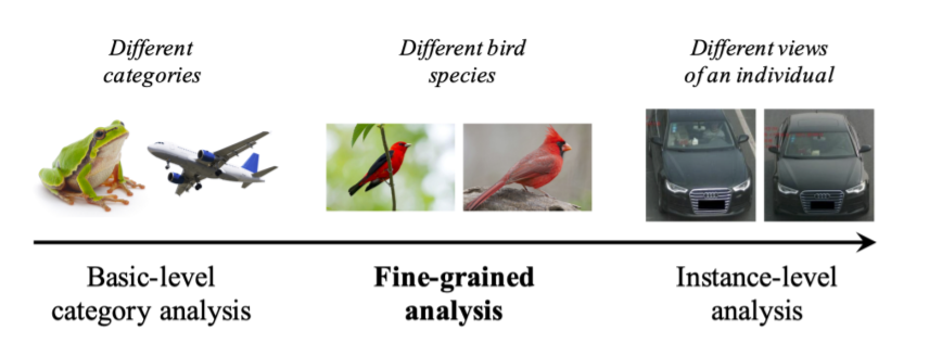 细粒度图像分析(Fine-grained image analysis, FGIA)专注于处理同一元类别畴中属于多个从属类别的物体(例如不同种类的鸟类或不同型号的汽车),通常涉及两个中心任务:细粒度图像识别和细粒度图像检索。如图3所示,细粒度分析存在于基础级类别分析(即通用图像分析)和实例级分析(如个体识别)之间的连续体中。