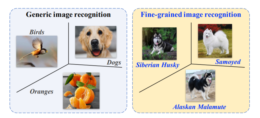 计算机视觉中FGIA的目标是检索和识别属于超类别(即元类别或基本类别)的多个从属类别的图像,如不同种类的动物/植物、不同型号的汽车、不同种类的零售产品等。