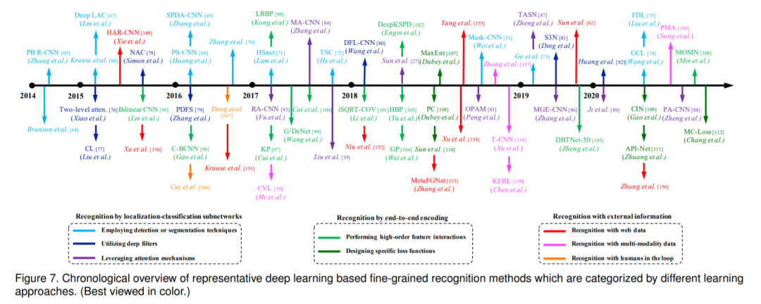 图4 基于深度学习的有代表性的细粒度识别方法,并根据不同的学习方法进行了分类