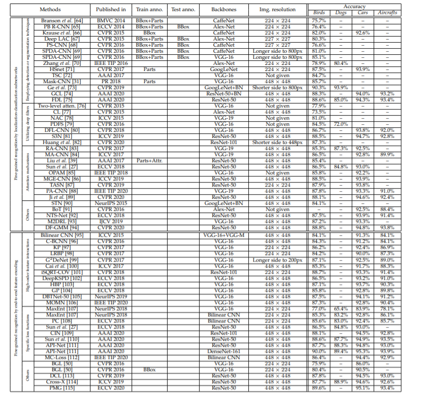 比较两种学习范式(参见5.1节和5.2节)在细粒度基准数据集上的细粒度识别结果,即Birds (CUB200-2011[13])、Dogs (Stanford Dogs[42])、Cars (Stanford Cars[43])和Aircraft (FGVC Aircraft[44])。请注意,“火车anno。”和“测试无名氏”。“指分别在训练和测试阶段使用的受监督信号。”符号“-”表示结果不可用。