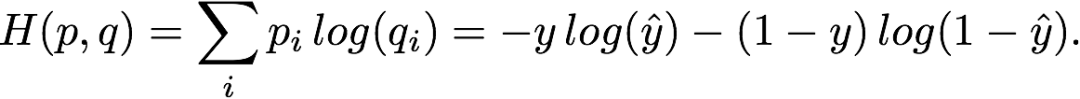 不管是在二分类问题还是多分类问题中,交叉熵是 logistic 回归和神经网络中的标准损失函数。通常,p 是真实分布,q 是模型描述的分布。让我们来看一个二分类 logistic 回归中的一个例子。两个类别的标签分别是 0 和 1,logistic 模型给每一个输入赋予以下概率:q_(y=1) =y_hat,q_(y=0) = 1- y_hat。这个可以简写为 q ∈ {y_hat, 1 − y_hat}。尽管真实标签是精确的 0 和 1,但是这里还是写成 p ∈ {y, 1 − y},因此不要被这个表达方式搞混。在这个标记下,每个样本的真实值和估计分布之间的交叉熵如下: