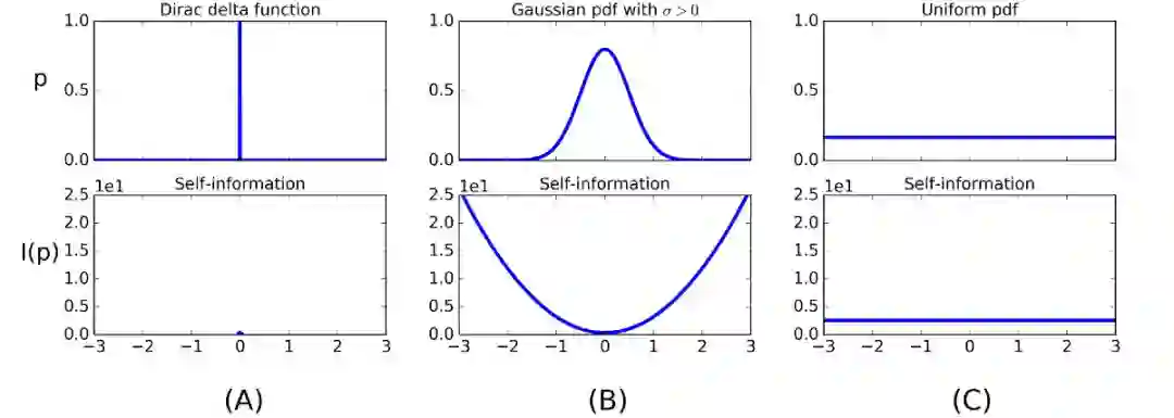 我们也可以计算连续随机变量的自信息。图 2 展示了三种不同的概率密度函数及其对应的信息函数。图 2(A)所示的 Dirac delta 对应着很强的偏差,总是同一面朝上的偏畸硬币对应着零熵。所有 p(x)= 0 的地方都对应着无限高的信息量。然而,由于这些零概率的事件永远不会发生,所以这只是一个假设。图 2(B)中的高斯概率密度函数就是对那种经常同一面朝上,但不总是同一面朝上的情况的模拟。最后,图 2(C)描述的是一个均匀分布概率密度函数,它对应着均匀的信息量,和我们没有偏畸的硬币是类似的。