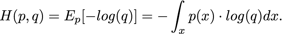 交叉熵是一个用来比较两个概率分布 p 和 q 的数学工具。它和熵是类似的,我们计算 log(q) 在概率 p 下的期望,而不是反过来: