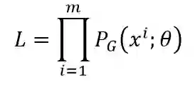 其中「∏」代表累乘、P_G(x^i;θ) 代表第 i 个样本在生成分布出现的概率。从该似然函数可知,我们抽取的 m 个真实样本在 P_G(x;θ) 分布中全部出现的概率值可以表达为 L。又因为若 P_G(x;θ) 分布和 P_data(x) 分布相似,那么真实数据很可能就会出现在 P_G(x;θ) 分布中,因此 m 个样本都出现在 P_G(x;θ) 分布中的概率就会十分大。