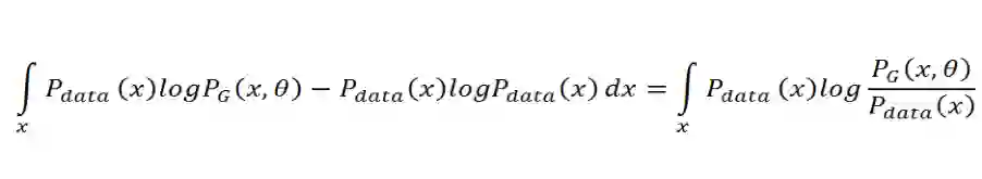 这一个积分就是 KL 散度的积分形式,因此,如果我们需要求令生成分布 P_G(x;θ) 尽可能靠近真实分布 P_data(x) 的参数θ,那么我们只需要求令 KL 散度最小的参数θ。此外,我们可以将 KL 散度的积分形式转换为我们熟悉的 KL 散度表达式:
