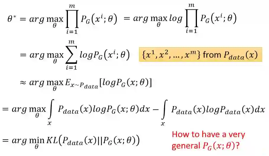 在李弘毅的讲解中,KL 散度可以从极大似然估计中推导而出。若给定一个样本数据的分布 P_data(x) 和生成的数据分布 P_G(x;θ),那么 GAN 希望能找到一组参数θ使分布 P_g(x;θ) 和 P_data(x) 之间的距离最短,也就是找到一组生成器参数而使得生成器能生成十分逼真的图片。