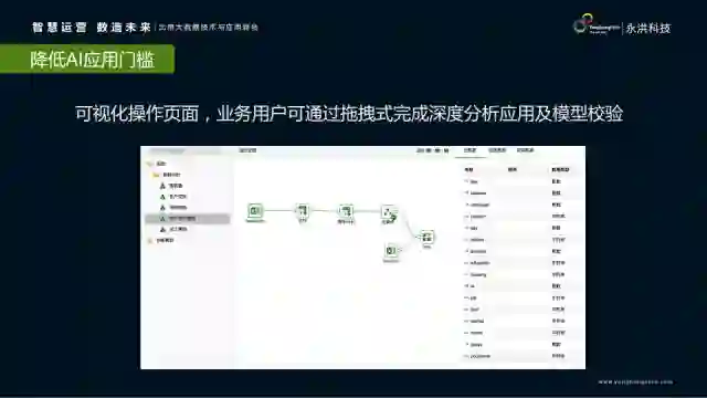 过去,企业在做深度分析的时候,需要借助IT部门及专业的数据挖掘人员,往往过程耗时长。在永洪平台中,具备自服务数据准备功能,能够更便捷的帮助业务人员完成数据准备。之后,基于可视化拖拽的方式,就可以完成深度分析应用及模型的检验,普通业务人员经过简单培训后即可操作。