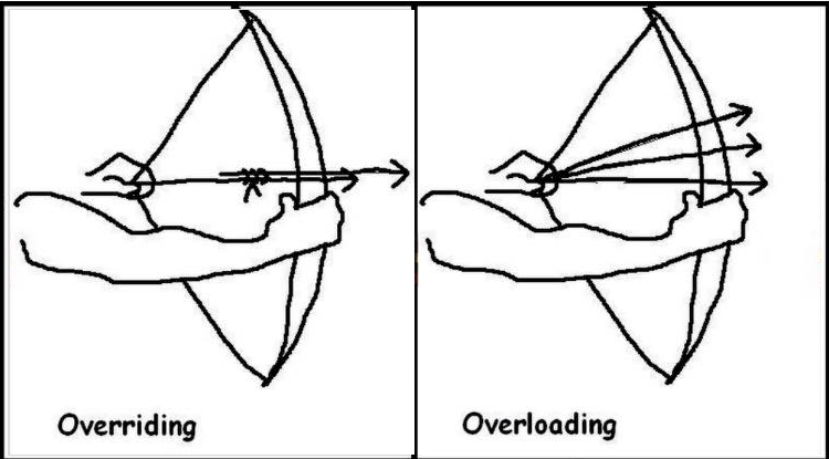 重载的两个方法名相同,但方法参数的个数不同,另外也不涉及到继承,两个方法在同一个类中。就好像类 LaoWang 有两个方法,名字都是 read(),但一个有参数(书名),另外一个没有(只能读写死的一本书)。