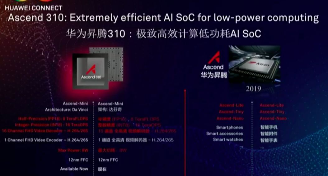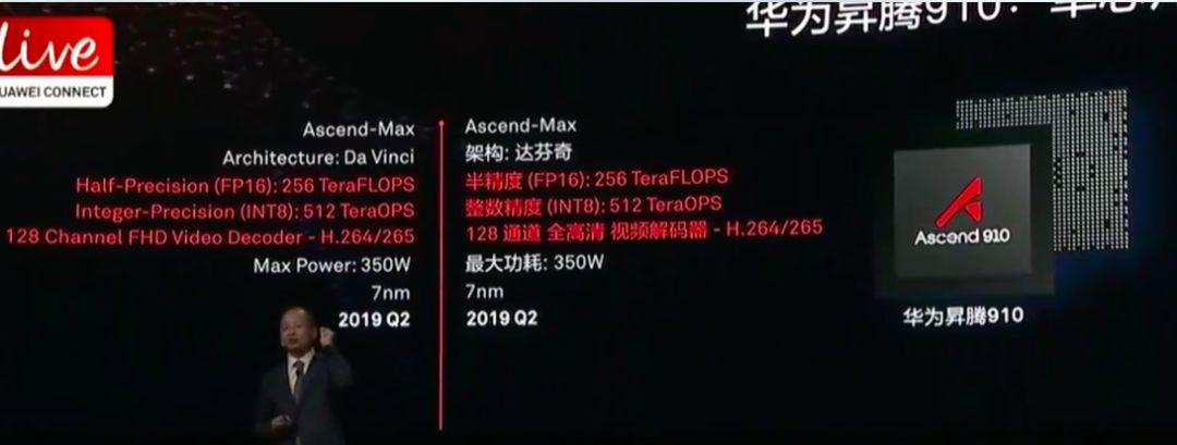 徐直军宣布,一直以来华为都在研发AI芯片,在此正式发布两款AI芯片:昇腾910和昇腾310。