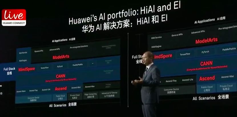 华为把人工智能定位为一个通用技术,希望把AI和华为的产品和解决方案融合起来,构建全栈、全场景的人工智能解决方案。