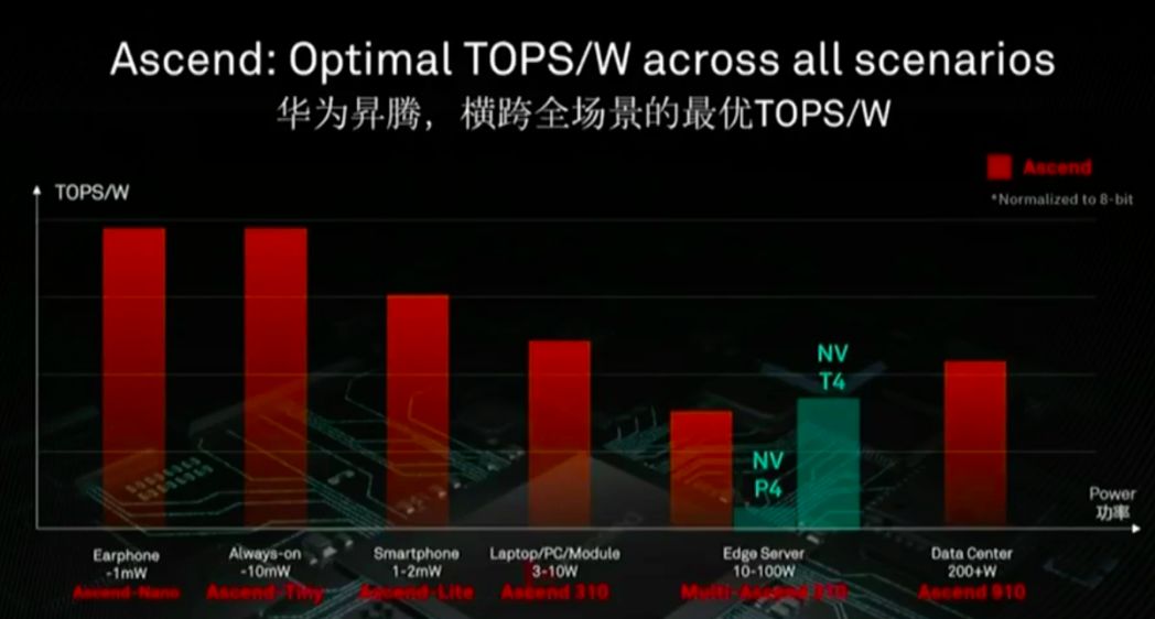 徐直军称,昇腾910是目前单芯片计算密度最大的芯片,计算力远超谷歌及英伟达,而昇腾310芯片的最大功耗仅8W,是极致高效计算低功耗AI芯片,两款芯片预计明年第二季度正式上市。
