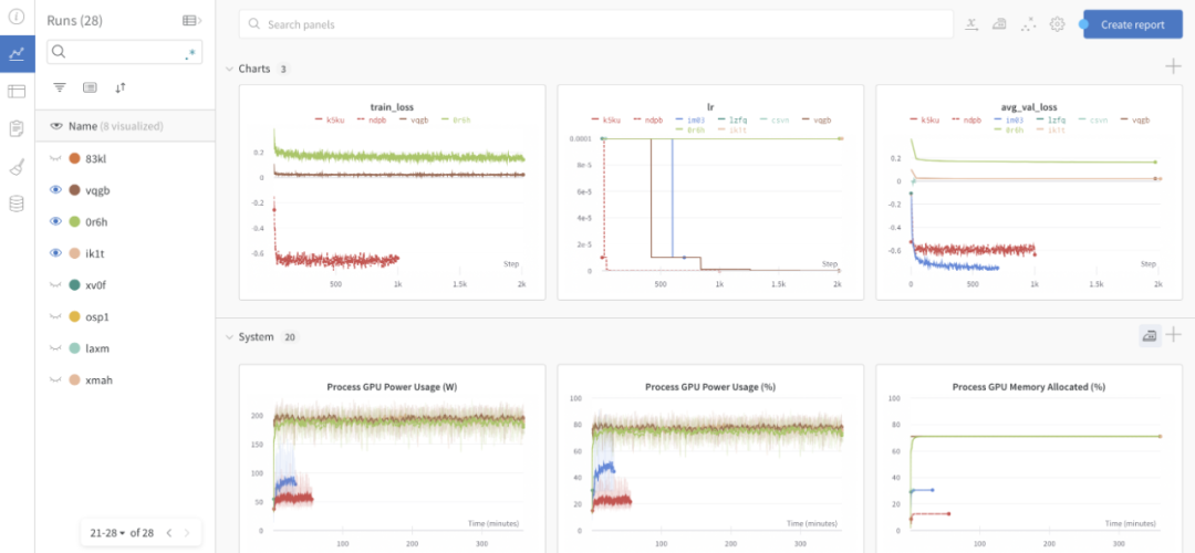 wandb panel 一组简单指标 Snapshot——训练损失、学习率和平均验证损失。请注意,你还可以跟踪系统参数。