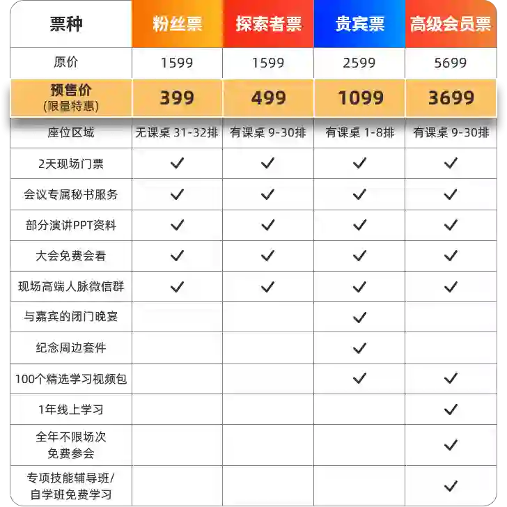 本次广州产品经理大会,现场仅开放500个座位,名额有限,先到先得!首轮预售优惠票低至399元起,仅剩最后20张!预售票售罄就要涨价咯!