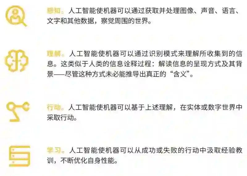 我们并未像许多人那样,不断尝试去明确地描述人工智能,而是倾向于将此类技术视为一套能力框架。毫无疑问,这是了解人工智能、知晓其背后广泛技术的最佳方式。我们的框架以人工智能支持机器实现的主要功能为核心,其中包括以下四个方面: