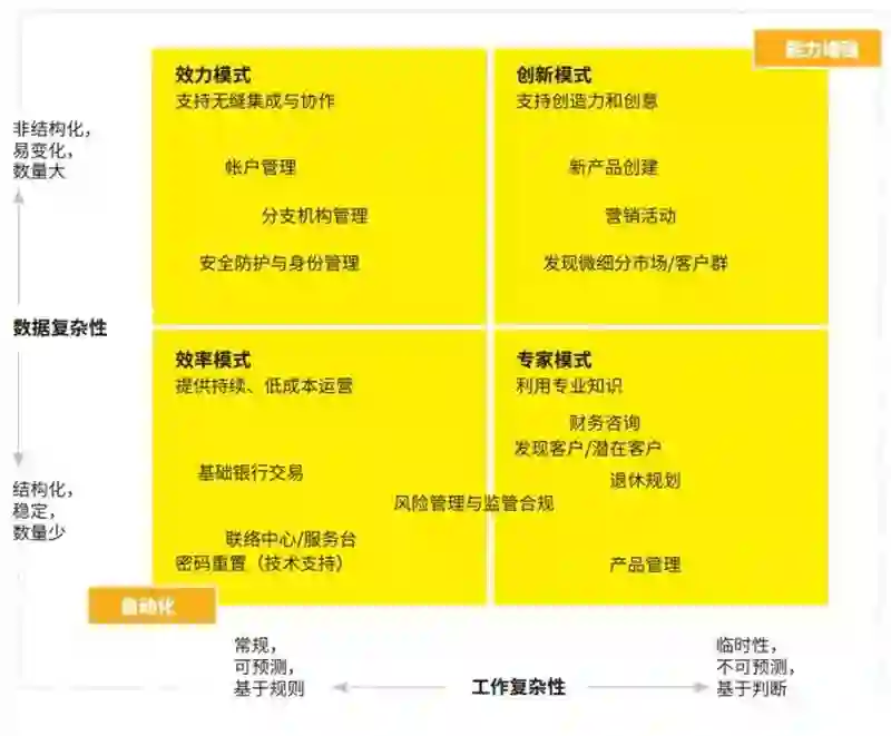随着企业持续加大人工智能的应用力度,系统所能处理的数据和工作的复杂性必然有增无减。若想了解其如何在业务环境中发挥作用,下方框架可能会有所帮助。此框架列出了各种技术的潜在应用形式(本文以金融服务行业为例),并根据所涉及数据和工作的复杂程度,将人工智能应用分为四大模式——效率、效力、专家、创新。