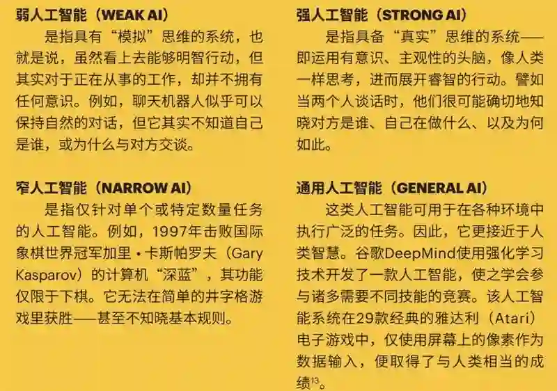 当数据科学家和其他人士讨论人工智能时,他们通常使用两个对比类别来阐明其含义:窄人工智能与通用人工智能,以及弱人工智能与强人工智能。