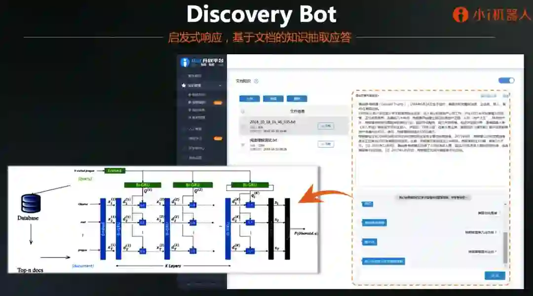 Discovery Bot 是指对用户问题的启发式响应回答能力。对于用户问题如果 FAQ Bot 和 Deep Bot 无法提供匹配的答案,则进入启发式响应回答环节。启发式响应环节的数据来源广泛,包括非结构化的文档,内部积累的数据,用户历史日志,外部抓取数据等等,基于非结构化数据获取多个答案候选,排序后如果置信度较高则直接返回给用户,置信度低的答案会结合人工审核或者直接人工介入回答,同时该问答也会进入知识库,进一步累积数据。