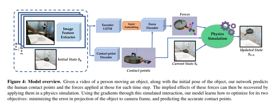 当我们人类观看人机交互的视频时,我们不仅可以推断出发生了什么,我们甚至可以提取可操作的信息并模仿这些交互。另一方面,当前的识别或几何方法缺乏动作表征的物质性。在这篇论文中,我们朝着对行为的物理理解迈出了一步。我们解决了从人类与物体互动的视频中推断接触点和物理力的问题。解决这一问题的主要挑战之一是为物理力取得真实标签。我们通过使用物理模拟器来进行监督,从而避免了这个问题。具体来说,我们使用一个模拟器来预测效果,并执行估计的力必须导致与视频中描述的相同的效果。我们定量和定性结果表明,(a)我们可以从视频中预测有意义的力,这能够导致对观察动作的准确模仿,(b)通过为接触点和力预测联合优化,我们可以在所有任务提高性能相比,和(c)我们可以从这个模型学习一个表示,泛化到使用小样本的物体上。
