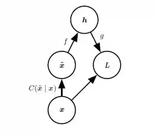 去噪自编码器代价函数的计算图。去噪自编码器被训练为从损坏的版本~x 重构干净数据点x。这可以通过最小化损失L = -log pdecoder(x|h = f(~x)) 实现,其中~x 是样本x 经过损坏过程C(~x| x) 后得到的损坏版本。