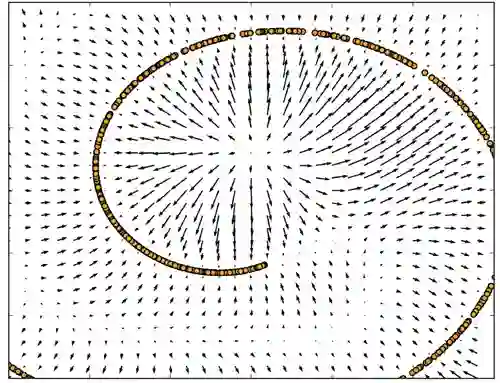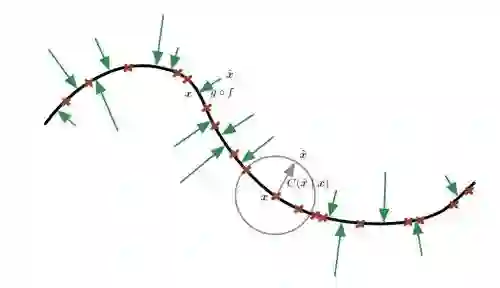 由去噪自编码器围绕1 维弯曲流形学习的向量场,其中数据集中在2 维空间中。每个箭头与重构向量减去自编码器的输入向量后的向量成比例,并且根据隐式估计的概率分布指向较高的概率。向量场在估计的密度函数的最大值处(在数据流形上)和密度函数的最小值处都为零。例如,螺旋臂形成局部最大值彼此连接的1维流形。局部最小值出现在两个臂间隙的中间附近。当重构误差的范数(由箭头的长度示出)很大时,在箭头的方向上移动可以显著增加概率,并且在低概率的地方大多也是如此。自编码器将这些低概率点映射到较高的概率重构。在概率最大的情况下,重构变得更准确,因此箭头会收缩。