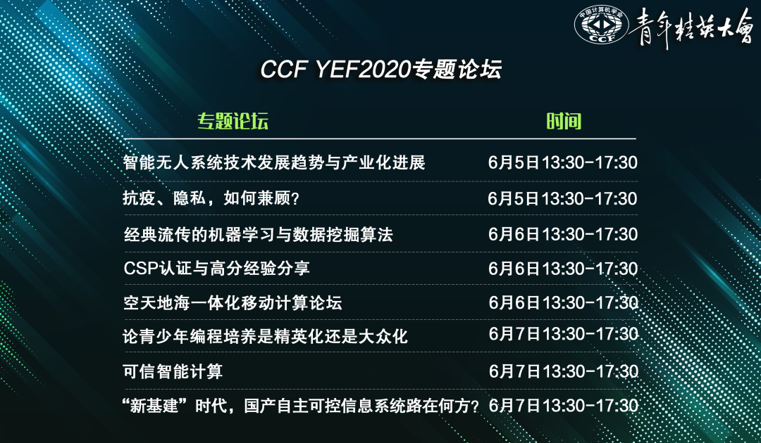 YEF2020 6 月 5 日-7 日召开在即,在这场以“制胜激变,智谋未来”为主题的计算领域学术界企业界的年度交流盛会上,国内外极富威望的顶级专家学者、企业风云人物将共商中国科技发展之机。各领域专家将通过大会报告、技术论坛、观点论坛等,集中探讨如何以科技力量对抗和解决后疫情时期的经济社会问题,并对未来技术热点和发展前景等展开热议。