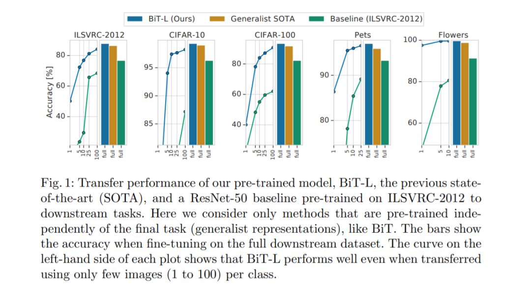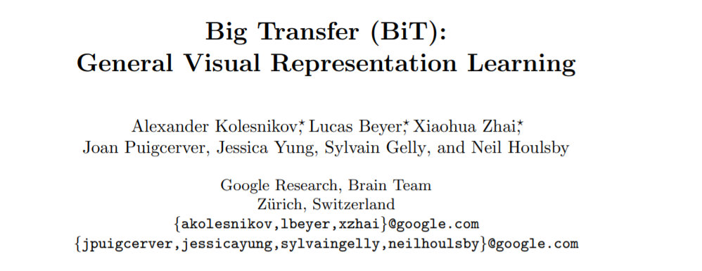 在为视觉训练深度神经网络时,预训练表示的迁移提高了样本效率并简化了超参数调整。我们回顾了在大型监督数据集上进行预训练和在目标任务上对模型进行微调的范例。我们扩大了预训练的规模,并提出了一个简单的方法,我们称之为大迁移(BiT)。通过组合一些精心选择的组件,并使用一个简单的启发式传输,我们在20多个数据集上实现了强大的性能。BiT在非常广泛的数据范围内执行得非常好——从每个类1个示例到总共100万个示例。BiT在ILSVRC-2012上达到87.5%的top-1准确率,在CIFAR-10上达到99.4%,在19个任务的视觉任务适应基准(VTAB)上达到76.3%。在小型数据集上,在ILSVRC-2012上BiT达到了76.8%,每个类有10个例子,在CIFAR-10上达到了97.0%,每个类有10个例子。我们对导致高迁移性能的主要部件进行了详细的分析。