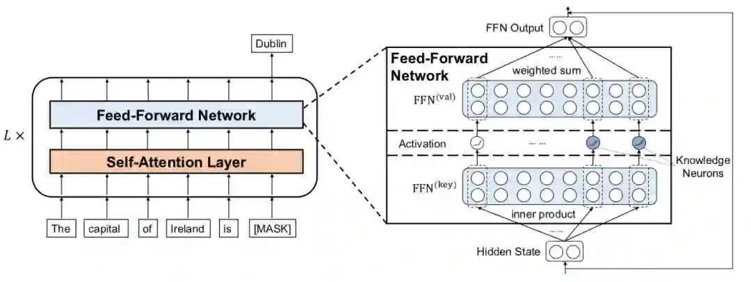 图3:研究员们把 FFN 模块类比为键-值记忆模块,而知识神经元存在于其中