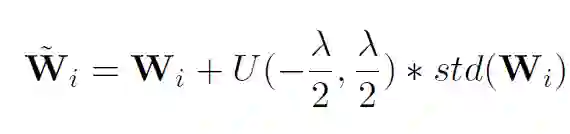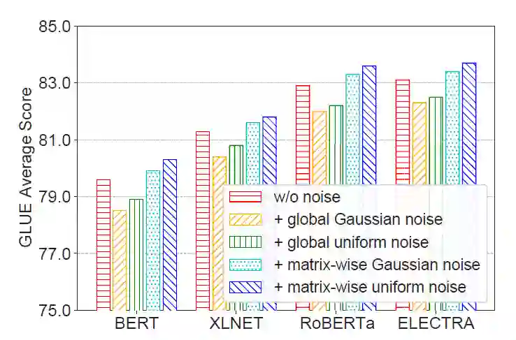 研究员们认为,对 PLM 添加少量噪声可以帮助模型“探索”更多潜在的特征空间,从而减轻对预训练任务和数据的过拟合问题。为了更好地保留语言模型的知识,研究员们提出了一种根据参数矩阵的方差添加均匀噪声的方法,这种方法能够根据不同类型参数的特点添加合适强度的噪声,其公式如下。其中超参数λ控制了添加噪声的强度。