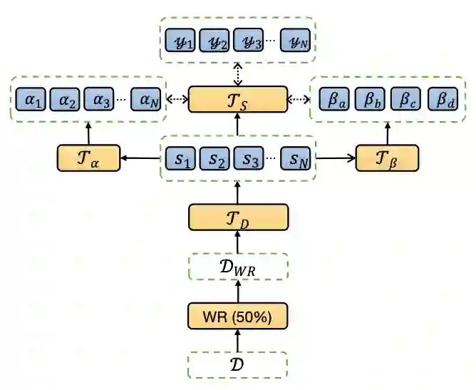 NLSSum 通过神经搜索的方式来对多语言标签中不同标签集合赋予不同的权重,并最终得到每个句子加权平均的标签。本文就是使用这种最终的标签在英文数据集上训练抽取式摘要模型(见图5)。其中,每个句子的标签得分综合考虑了句子级别权重预测器 T_α 以及标签集合级别权重预测器 T_β 的结果。和单语言标签相比,多语言标签中存在更多的跨语言语义和语法信息,因此 NLSSum 模型在数据集 MLSUM 的所有语言数据集上均大幅度超越了基线模型的分数,甚至超越了未使用预训练模型的有监督方法(Pointer-Generator)。