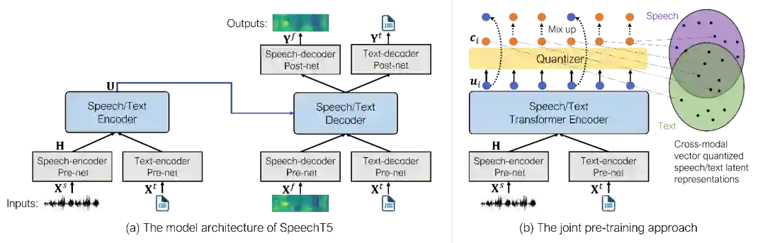 图1:(a)是 SpeechT5 模型结构,该模型架构包含一个编码器-解码器模块和六个模态特定的前处理/后处理网络。(b)是联合预训练方法,通过在不同模态之间共享潜在量化向量,联合预训练方法搭建起了语音和文本之间的桥梁。