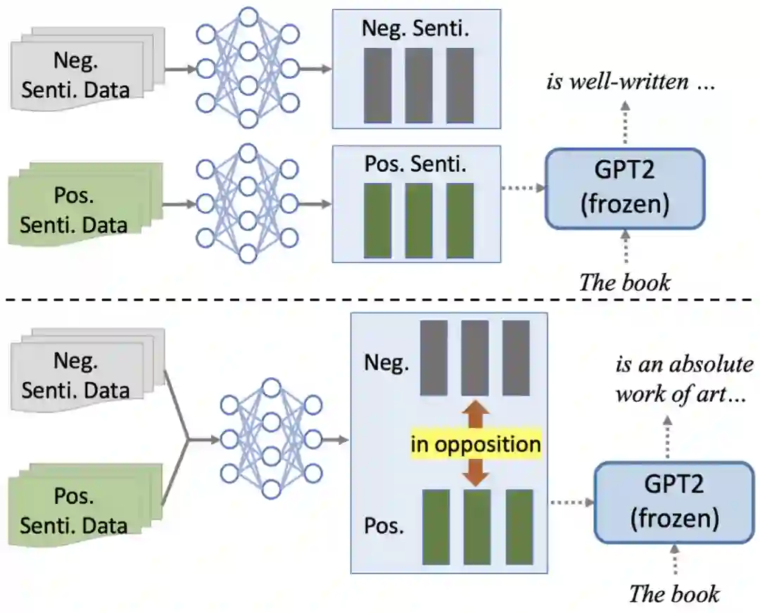 图2: Prefix-tuning(上)和本文方法(下)在情感控制任务上的比较。实线箭头表示训练过程,虚线箭头表示生成过程。在本文提出的框架中,训练可以是有监督的、半监督的、或者无监督的。