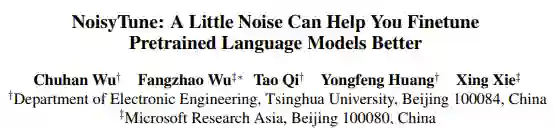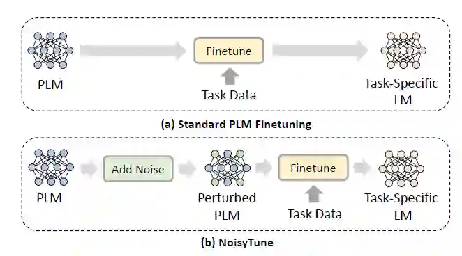 预训练语言模型是近年来自然语言处理领域备受关注的热门技术之一。在下游任务中如何有效地微调预训练语言模型是其成功与否的关键。目前已有的许多方法直接利用下游任务中的数据来微调预训练语言模型,如图6(a)所示。但是,研究员们认为语言模型也存在过拟合预训练任务和数据的风险。由于预训练任务与下游任务通常存在鸿沟,已有的微调方法较难快速地从预训练空间迁移到下游任务空间,特别是当下游任务的训练数据较为稀少时。针对这一问题,微软亚洲研究院的研究员们提出了一种简单而有效的解决方案,即在微调之前添加少量噪声来扰动预训练语言模型,名为 NoisyTune。其范式如图6(b)所示。