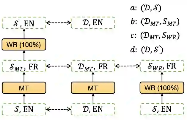图4:多语言抽取式摘要标签构建。a为在英文上获得的标签集合,b、c、d为对英文训练集进行机器翻译(MT)和双语词典替换(WR)而获得的标签集合。