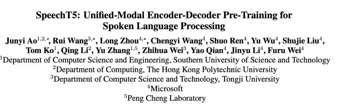 编码器-解码器框架广泛应用于自然语言处理和语音处理领域,比如端到端的神经机器翻译模型和语音识别模型。受 T5(Text-To-Text Transfer Transformer)在自然语言处理预训练模型上应用成功的启发,本文提出了一个统一语音模态和文本模态的联合框架 SpeechT5,该框架探索了基于自监督语音和文本表示学习的编码器-解码器预训练方法。