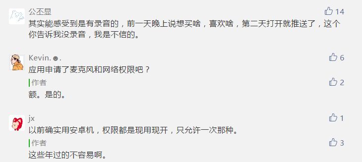 该专家还表示,新闻报道中,通过聊天测试并联想到外卖App窃听用户语音,“这种证明方法完全不科学”,存在偶合性;科学的方法应该是做软件行为分析和数据流量分析,而不是做用户行为统计。