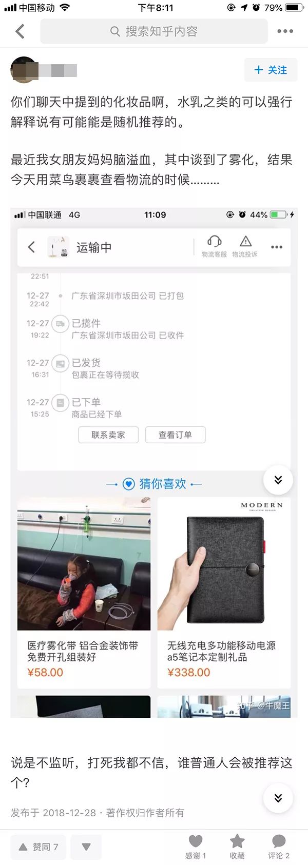 无独有偶,2018年12月28日,也有网友发帖称,其女友妈妈患脑溢血,聊天时曾谈到“雾化”,随后在使用“菜鸟裹裹”查看物流时,在“猜你喜欢”一栏中看到了医疗雾化带的推荐。