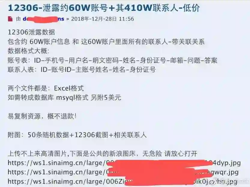 12月28日,有人在中文暗网交易网站 deepmix5e3vptpr2.onion(访问需要经过 Tor 且需要注册)发帖出售 12306 网站用户数据,数据包含了 60 万账户和 410 万联系人,包括了用户 ID、手机号、密码、身份证、邮箱、问题答案等等。价格很低,只需要价值 20 美元的比特币。
