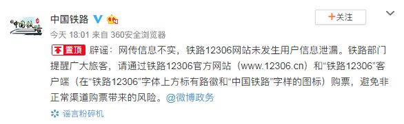 辟谣:网传信息不实,铁路12306网站未发生用户信息泄漏。铁路部门提醒广大旅客,请通过铁路12306官方网站(www.12306.cn)和“铁路12306”客户端(在“铁路12306”字体上方标有路徽和“中国铁路”字样的图标)购票,避免非正常渠道购票带来的风险。