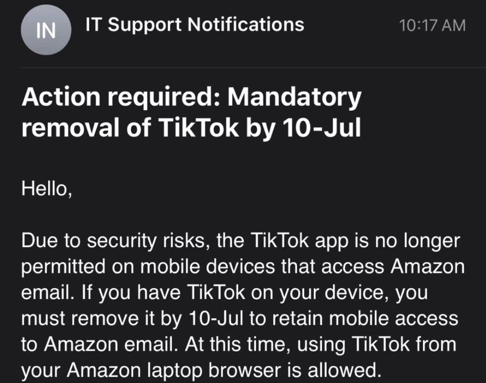今日早些时候,据《纽约时报》报道,亚马逊给员工(截至第一季度末,亚马逊在全球范围内拥有约 84 万名员工)发送了一封邮件,称出于“安全风险”考虑,员工禁止在可以访问工作邮箱的手机上使用 TikTok,已经安装的必须在 7 月 10 日之内删除。但员工可以在电脑端的浏览器上继续使用 TikTok。纽约时报记者泰勒·洛伦兹在推特上公布了这封电子邮件的截图。