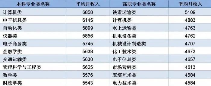 7 月 9 日,麦可思研究院发布《就业蓝皮书》,报告显示,2019 届本科毕业生平均月收入为 5440 元,高职毕业生平均月收入为 4295 元;剔除通货膨胀因素影响外,与 2015 届相比,五年来本科生起薪涨幅为 23.6%,高职生起薪涨幅为 15.7%。其中,计算机类、电子信息类、自动化类等本科专业毕业生薪资较高,2019 届平均月收入分别为 6858 元、6145 元、5899 元;铁道运输类、计算机类、水上运输类等高职专业毕业生薪资较高,2019 届平均月收入分别为 5109 元、4883 元、4763 元。