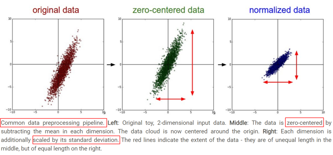 从几何上观察上述方法的作用,图片来自CS231n-Neural Networks Part 2: Setting up the Data and the Loss,zero-mean将数据集平移到原点,unit-variance使每维特征上的跨度相当,图中可以明显看出两维特征间存在线性相关性,Standardization操作并没有消除这种相关性。