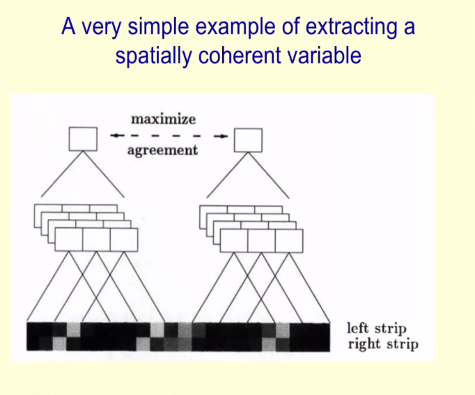 然后,Hinton 详细介绍了他与 Suzanna Becker 在 1992 年提出的一种提取空间一致性特征的方法。该方法的核心理念是对输入的两个非重叠块(non-overlapping patch)表示之间的显式互信息进行最大化处理。Hinton 给出了提取空间一致性变量的简单示例,如下图所示: