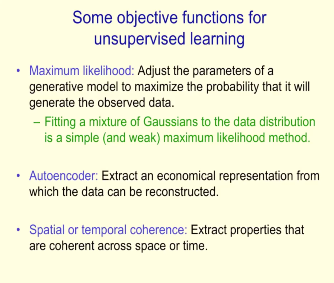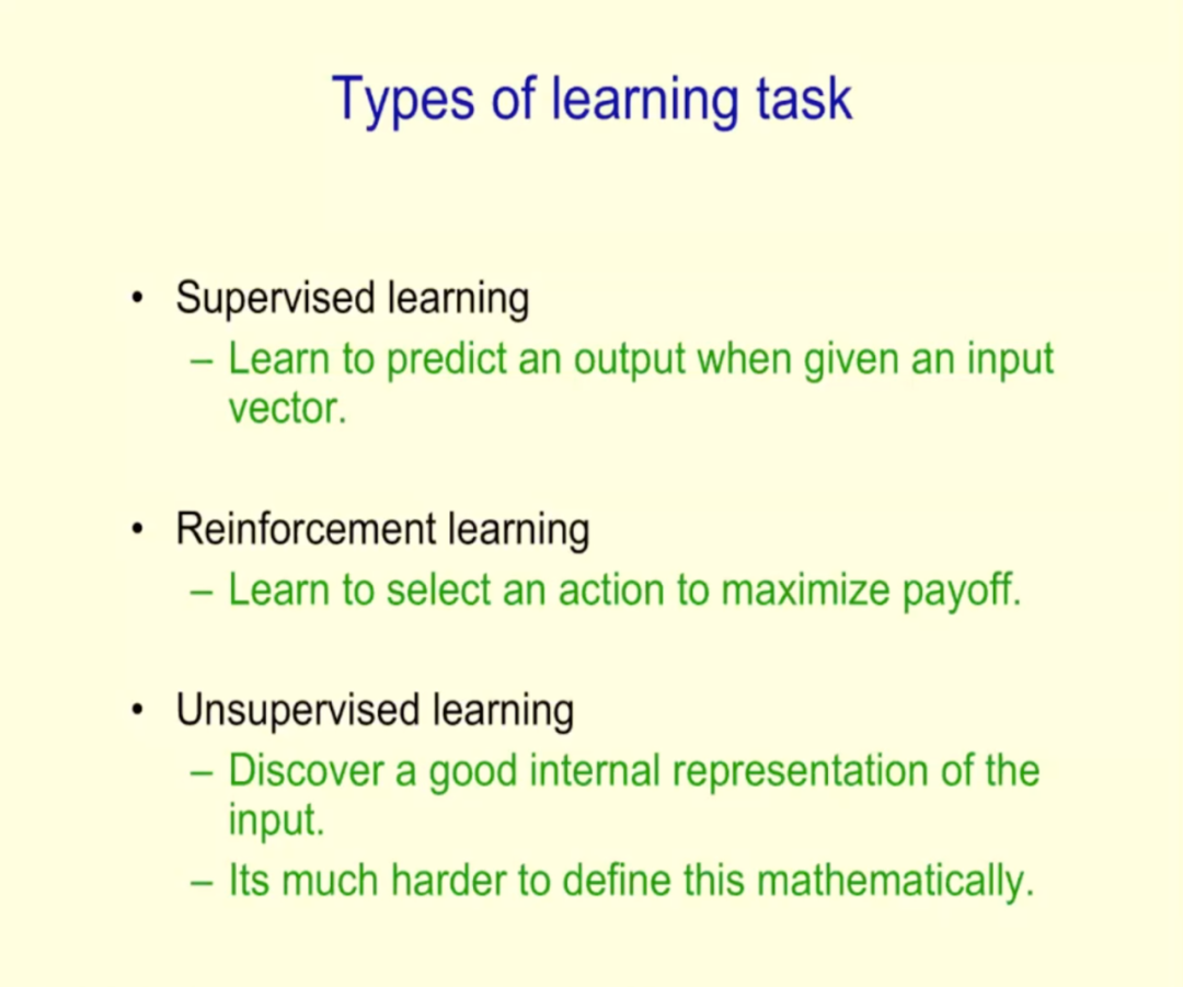 演讲一开始,Hinton 先介绍了三种学习任务:监督学习、强化学习和无监督学习,并重点介绍了无监督学习的必要性。